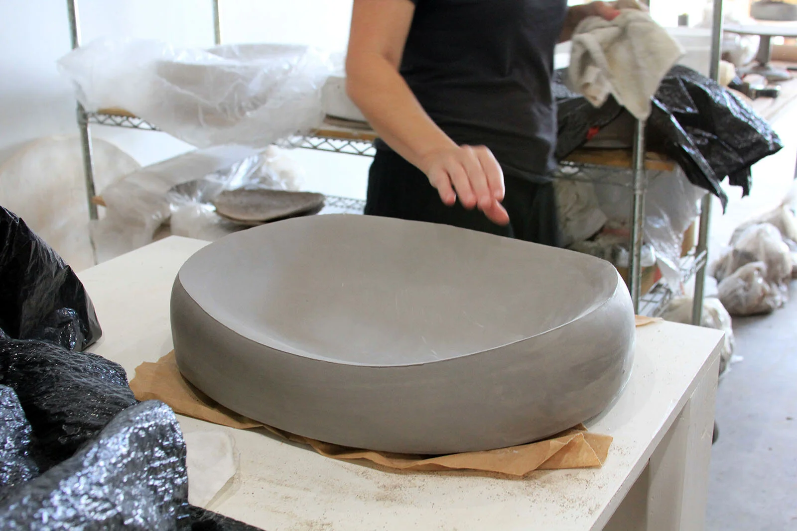 Erica shows one of the unfinished, pillow-like, slip cast sinks that she can customize with glaze and surface texture as desired. Before glazing she will make a hole and depression for the drain and the surface will be sealed for durability once complete.